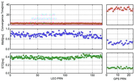 We estimated the LEO satellite clock from DOY 305 to 311, 2019, for all simulated LEO and GPS satellites to analyze the estimated LEO satellite clock comprehensively. Differenced with the simulated precise clock products, Figure 5 demonstrates the statistical results about convergence time, RMS, and STD after convergence averaged over DOY 305–311, 2019, for LEO and GPS satellites. The three subplots on the left represent LEO satellites and the three subplots on the right represent GPS satellites for comparison. Table 3 illustrates the average convergence time, RMS, and STD for all LEO and GPS satellite clocks based on Figure 5. The convergence time of LEO satellite clock was considerably lower than that of the GPS satellite clock, which is consistent with the results shown in Figure 3. The average convergence time was 2.86 min for the LEO satellite clock, whereas the value was 31.21 min for the GPS satellite clock. The average RMS and STD values after convergence were 0.71 ns and 0.39 ns for LEO satellite clock, respectively, whereas the values were 0.31 ns and 0.13 ns for the GPS satellite clock. The RMS and STD after convergence of the LEO satellite clock were slightly higher than those of the GPS satellite clock in Figure 5 and Table 3. Such a difference was caused by the exact short tracking arcs of LEO satellites.
