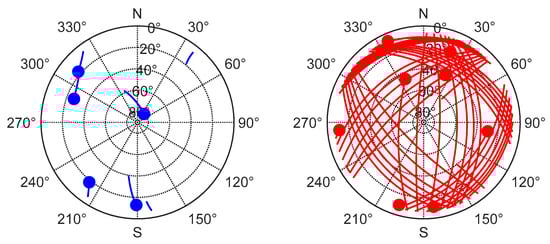 The sky plot for GPS and LEO satellites within 1 h at WUHA station. The red and blue subplots represent LEO and GPS satellites, respectively.