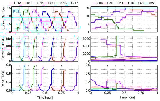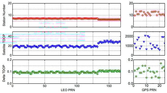 Number of visible stations where one satellite can be observed, satellite time dilution of precision (TDOP), and delta TDOP for LEO and GPS satellites for 1 h. The satellite TDOP was calculated using one satellite relative to multiple ground tracking stations.