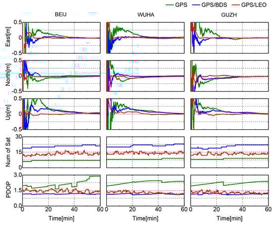 Figure 9 presents comparisons of GPS-only, GPS/BDS, and GPS/LEO PPP solutions with the estimated LEO satellite clock at stations BEIJ, WUHA, and GUZH for DOY 305, 2019. It was found that the participation of LEO satellites did not improve the number of visible satellites and PDOP as remarkably as BDS satellites did. The average number of visible satellites and PDOP values for GPS/BDS were 19.58 and 1.18, respectively, whereas that values for GPS/LEO were 12.43 and 1.34, respectively. However, LEO could still accelerate PPP convergence more substantially than BDS with the real-time estimated LEO satellite clock. The average convergence time for GPS/BDS and GPS/LEO PPP was 26.12 min and 10.87 min, respectively. Although additional errors of the LEO satellite clock were introduced into the positioning results, the rapid variation in PDOP values caused by the rapid movement of LEO satellites was sufficient to compensate for this shortcoming.