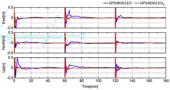 Figure 10 shows comparisons of LEO-augmented GNSS PPP solutions for GPS/BDS/LEO (with the estimated LEO satellite clock) and GPS/BDS/LEO0 (with the simulated precise clock) at station WUHA for DOY 305, 2019. The subscript 0 means the use of the simulated precise clock as a reference. As we can see, the convergence time of LEO-augmented GNSS PPP with the estimated LEO satellite clock was slightly longer than that with the simulated precise clock. This result was not only caused by errors in the real-time estimated LEO satellite clock, but a few minutes of the convergence time of the LEO satellite clock also exacerbated this effect. Nonetheless, the participation of LEO satellites can still substantially shorten the convergence time of GNSS PPP with the real-time estimated LEO satellite clock.