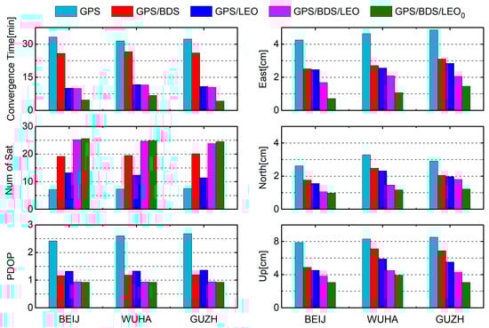 We computed PPP solutions from DOY 305 to 311, 2019, for GPS-only, GPS/BDS, GPS/LEO, GPS/BDS/LEO, and GPS/BDS/LEO0 at stations BEIJ, WUHA, and GUZH to analyze the performance of LEO-augmented GNSS PPP solutions with the real-time estimated LEO satellite clock comprehensively. The processes of PPP calculation were restarted every 2 h to acquire more information about convergence time. Figure 11 shows the statistical results about the convergence time, number of satellite, PDOP value, and positioning errors in east, north, and up components after convergence averaged for 7 days. It can be obviously found that the augmented effect of LEO on GPS PPP was better than that of BDS with the estimated LEO satellite clock, especially in convergence time. The former shortened the convergence time and improve the positioning accuracy by 66%, 43%, 34%, and 35% in the east, north, and up components, respectively, which is consistent with the results in Figure 9. The convergence time and positioning accuracy for LEO-augmented GNSS with the estimated LEO satellite clock reached 10.63 min, 1.94 cm, 1.44 cm, and 4.18 cm in the east, north, and up components, respectively. The improvements caused by LEO satellite for GPS/BDS PPP were 59%, 30%, 31%, and 33%, respectively.