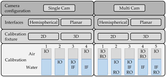 System components, calibration approaches for underwater photogrammetric systems. The left side illustrates options of configuration for single-camera usage; the right side illustrates options for multi-camera systems. Approaches 1 can be declared as unreasonable strategies, approaches 2 are standard strategies using standard software, explicit modelling approaches 3 are not part of this work but theoretically possible, approaches 4 and 5 model refractive effects explicitly using a known IO.