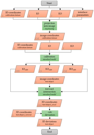 Schema of the creation of synthetic datasets. After error-free images, the coordinates are calculated via strict ray tracing, the calibration is conducted using standard software and implicit modelling. The 3D coordinates are calculated via forward intersection of a stereo image pair, based on the standard model. These coordinates are compared to the nominal values of simulated test object coordinates.