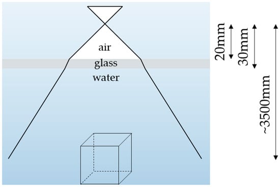 Photogrammetry taking more than one optical medium into account is known as multimedia photogrammetry. Many commercial and public use cases of photogrammetry such as fish farming [3,4], industrial inspection tasks [5], archaeological tasks [6] or surveying of cultural heritage [7] take place underwater, thus deal with multimedia photogrammetry. In the case of underwater photogrammetry, usually, three media are present. The optical path of light is bent at the interfaces water/glass on the way from the water into the camera housing and glass/air from the glass of the housing into the air just in front of the camera. The resulting refractive effects can either be compensated implicitly by the standard calibration parameters or explicitly by using an extended camera model within photogrammetric camera calibration. The camera calibration via bundle adjustment is a well-established technique and can be conducted using standard software when dealing with single-medium photogrammetry. When it comes to multimedia photogrammetry, this standard procedure might also be a reasonable tool. Standard software that model the refractive effects implicitly is often used by non-experts or interdisciplinary users. To use an explicit model, programming skills and expert knowledge in photogrammetry is required, since, best to the authors’ knowledge, no standard software is available for explicit photogrammetric camera calibration. In some cases, depending on the calibration strategy, and the application, it could be reasonable to use standard software, thus an implicit model. In other cases, it is crucial to model all refractive effects explicitly to gain the required accuracy. When no absolute error in object space is determined as in the majority of cases, errors like wrong scaling might remain undetected. As already depicted in [8], systematic errors occur in the forward intersection when the scale is provided only by the relative orientation of a multi-camera system.