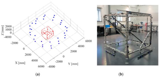 Setup of the synthetic dataset Cube. Blue points (36) indicate the positions of the cameras, red points (100) indicate the cubic arranged object points (a). Cubic test object, according to VDI/VDE 2634.1 (b).