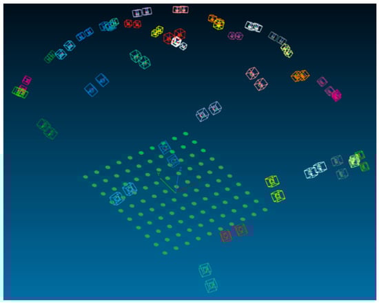 Half-sphere-shaped bundle. Green dots indicate 10 × 10 points of the calibration fixture. The points are spaced at 250 mm in each direction. Simulated stereo cameras are rotated around the optical axis by 90° at each position. The basis is 200 mm.