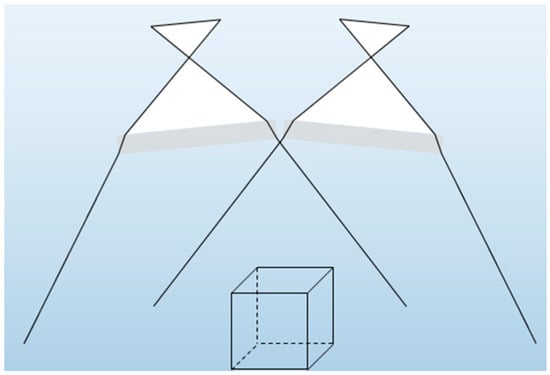 The synthetic dataset of the photogrammetric bundle consists of 100 object points and 36 well distributed exterior orientations. It is based on an accuracy evaluation test, according to the German guideline VDI/VDE 2634.1 [36] (see Figure 4). Cameras are rotated around the optical axis in some positions. In addition to the single-camera dataset, a dataset using a stereo system is simulated. The second camera is created with a baseline of 200 mm in the direction of the local x-axis (camera sensor) of the particular camera. In terms of a self-calibration bundle adjustment, this dataset presumably provides optimal data. The dimension of the calibration fixture is 2 × 2 × 1.5 m3, the average acquisition distance 3.5 m. Thus, this dataset represents a typical ROV application using an ideal spatial test-field, even though such a large object would be hard to handle underwater. Correlations should become as small as possible using such a dataset. By introducing bundle-invariant interfaces, this dataset is extended to a multimedia dataset. Variations of interface parameters and convergence of the stereo system will be discussed in Section 3.4 and Section 3.5.