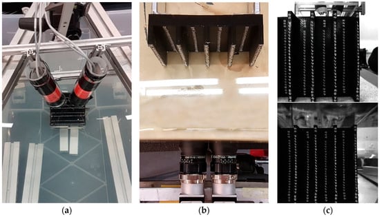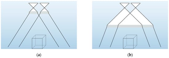 In Figure 18, the setups of the experiments can be seen. Two setups are realised—one parallel and one convergent setup at an angle of convergence of ~27°. Furthermore, an exemplary image in the air (Figure 18c, top) and through water (Figure 18c, bottom) are presented. The inverted radial distortion, introduced by refractive effects, can be noted at the image border. In both cases, 2D and 3D calibration fixtures are used to calibrate the stereo camera, thus yielding four datasets. Both objects consist of 246 uniformly distributed points of 1 mm in diameter, whereat the points are arranged in two levels (20 mm in height) at the 3D object and in only one at the 2D (flat) object. Twelve image pairs are taken for each calibration in a similar acquisition arrangement rotating and tilting the calibration fixture leading to an overall redundancy of 7000–10,000 depending on the setup. The average acquisition distance is 180 mm for all experiments.