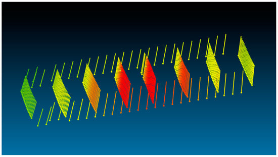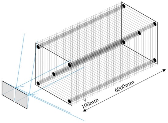 A test object of 500 mm × 500 mm is created and moved through the object space (Figure 8). The simulated 3D coordinates of this (moved) object can then be compared with the forward intersection results of one pair of images of the bundle. The object is shifted along the optical axis of the left camera in discrete steps of 100 mm, from just in front of the camera (once all five points are projected into both images) up to 6 m. Thus, approximately 50 test objects with five points each can be calculated via forward intersection and checked against nominal 3D coordinates for one image pair of the bundle. It would be possible to calculate each of the 36 stereo pairs. In the interest of clarity, one exemplary pair is analysed in this work. In the following, all analyses refer to this image pair of the specific bundle if not indicated otherwise.