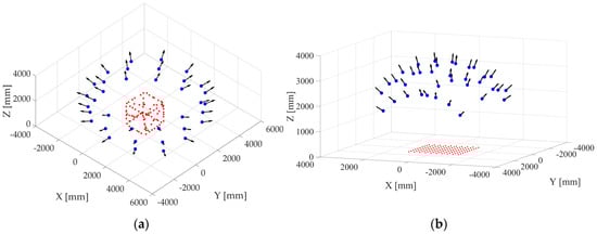 The dataset HS consists of a synthetic bundle in the form of a half-sphere (HS). The 2D object is made up of regularly spaced points at a distance of 250 mm. The 10 × 10 points result in a calibration fixture of 2500 mm × 2500 mm. The 36 camera positions reach down to 45° observation angle to simulate a realistic configuration (Figure 5). The average acquisition distance is 3.5 m as in dataset Cube. This dataset is created to simulate a different calibration fixture. In practice, often flat test-fields are used to calibrate stereo systems, as in [37]. The best configuration for a flat object is a half-sphere-shaped bundle. In real tasks, acquisition angles of less than 45° with respect to the targets on the calibration fixture often are avoided, since targets might not be measurable anymore, respectively have large elliptical eccentricity. Computer vision approaches often use such flat test-fields in the form of chessboard targets [37,38]. According to [29], 2D test-field calibrations result in less accurate and less robust parameter estimation. Furthermore, correlations between calibrated parameters usually are higher.