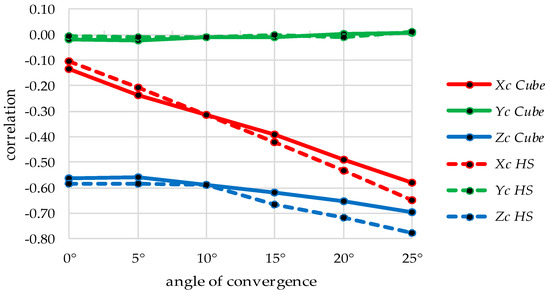 When analysing the correlations of the data, both datasets HS and Cube show similar trends. In general, the level of correlations is a little higher in the HS data. Some major correlations (higher than |0.5|) between relative and interior orientation can be identified (Table 6), where B represent the parameters of tangential and radial-asymmetric distortion according to [15]. Figure 10 shows the trend for increasing convergence exemplarily for the correlations of the principal distance and the translation parameters of the relative orientation. Relations between other parameters behave similarly showing higher correlations at larger angles of convergence. When the image coordinate is perfect, as in real case measurements, especially underwater, these correlations would lead to errors in correlated parameters. As Figure 10 implies, for parallel configurations (0°), discrepancies would rather occur in Z and/or c, while for convergent configurations (25°) discrepancies could also be highly possible in the direction of X, since the correlation of X and c converge to the one between Z and c with an increasing angle of convergence.