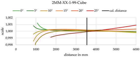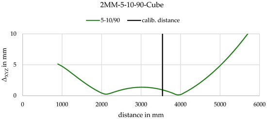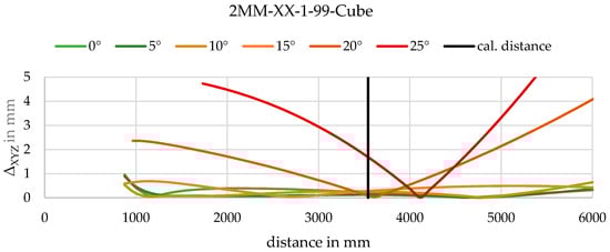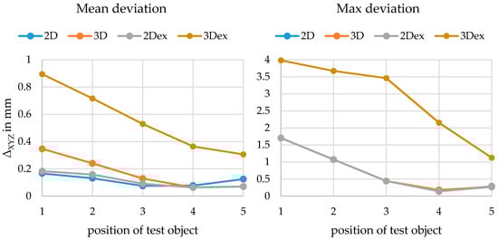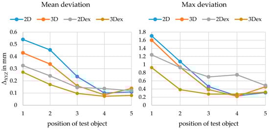 First, the parallel setup (Figure 20) is analysed. As expected, the mean deviation is the smallest near the calibration distance. The explicit method is much better (approx. factor 2) at further positions and similar in quality near the calibration distance. The implicit model seems to be “more valid” for a certain range near the calibration distance as simulations also identified. The performance of the spatial calibration fixture is slightly better than that of the 2D calibration fixture. Furthermore, the further away the object is, the worse the angle of intersection becomes and due to limited DOF, the quality of image measurement is also worse. Especially, the component in the direction of the optical axis is thus defective.