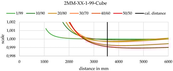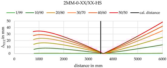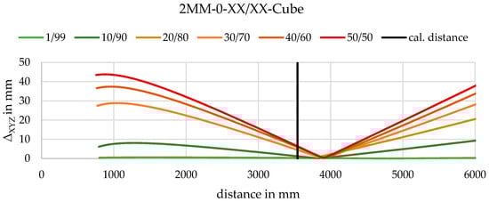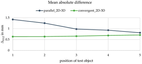 Besides the geometrical evaluation, a relative comparison of absolute positioning in the object space can be performed. Figure 22 shows the mean difference of the intersected points underlying the calibration parameters of 2D calibration to the points intersected underlying parameters of 3D calibration. No absolute positioning reference is known in the experiments; therefore, no statement can be given as to which calibration parameters result in more accurate results. However, a significant difference in the object space can be determined. Despite the identical geometry of both sets, 2D and 3D calibration have mean deviations between 0.55 mm and 0.1 mm (Figure 20), whereas the absolute difference is much higher in parallel cases and a little higher in convergent cases. When calculating the differences, it is visible that the difference is clearly in the direction of the optical axis of the cameras as can be found in Figure 23 exemplary.