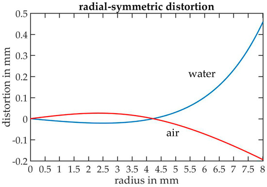 Radial-symmetric distortion of the calibrated cameras of Table 11 in air (red) and water (blue).