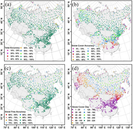 Validation of the daily cloud-free snow cover product using ground observation for each individual site during the period of 2000 and 2012. (a) Total accuracy, (b) Snow cover accuracy, (c) Snow free accuracy, and (d) Snow-covered days.