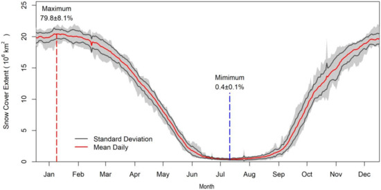 Average daily variation of snow cover extent (SCE) across the study area from 2000 to 2016. The red line represents the average daily value of SCE. The black lines show average daily SCE increases and decreases with one standard deviation, respectively. The grey region indicates the range of SCE of each day. The red dotted line shows the time of average maximum SCE of 27.08 × 106 km2 (79.8% of study area), that is January 7. The blue dotted line shows the time of average minimum SCE of 0.14 × 106 km2 (0.4% of study area), that is July 11.