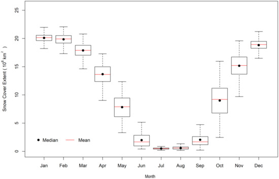Average monthly variation of SCE in the study area from 2000 to 2016. The black dots and red lines represent median and mean values, respectively.