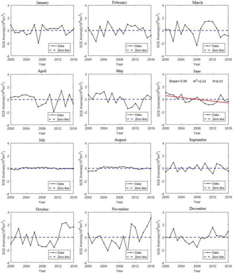 Figure 4 indicates the monthly variation of SCE from 2000 to 2016. In winter (from December to February of the following year), the SCE variation is small and relatively stable. On the contrary, it is relatively large during the period of the early stage of the snow accumulation (from September to November) and during the melting season (from March to May). Figure 5 shows that the monthly variations of SCE from 2000 to 2016 are different. The inter-annual change of SCE in summer (from June to August) is relatively small, but SCE decreases significantly in June with a rate of 0.06 × 106 km2/yr. The results are consistent with the conclusions of IPCC report [27], that is, the overall snow cover in the Northern Hemisphere is decreased, while the decreasing tendency of snow cover in spring is the most significant. The average monthly snow cover from October to December shows an increasing trend from 2000 to 2016, especially from 2011 to 2016. Overall, there is no obvious increasing or decreasing tendency as shown in (Figure 6).