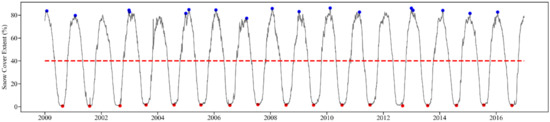 Daily variation of SCE in the study area from 2000 to 2016. The blue dots and red dots indicate the maximum and minimum SCE in every year, respectively.