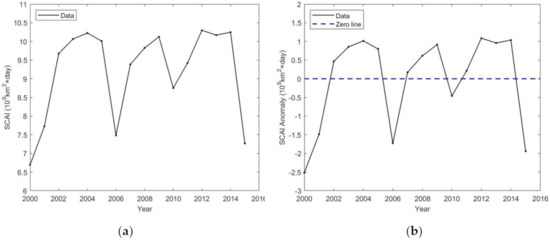 Inter-annual variation of snow cover area index (SCAI) in the study area from 2000 to 2016: (a) SCAI variation, and (b) SCAI anomaly, respectively.