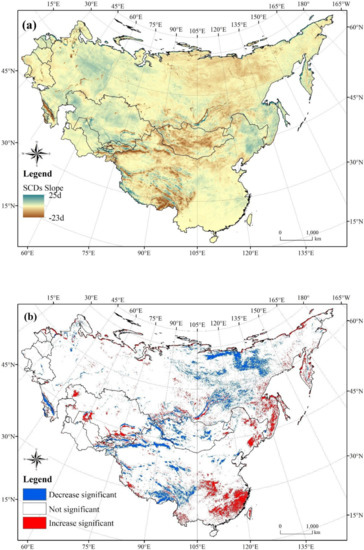 - The stable snow cover areas, accounting for 78.8% of the study area, are mainly located north of latitude 45° N and the mountainous area of western China. The SCDs increase significantly in 6.4% and decrease significantly in 9.1% of the regions, respectively. The decreasing areas are mainly located in the Siberian Plateau, Mongolian Plateau and Tibetan Plateau, while the significant increase occurs mainly in the instantaneous snow cover areas of northeastern and southern China.