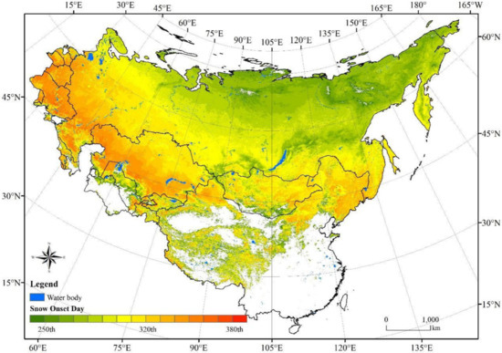 Previous satellite observations have shown a continuous decline in the spring SCE in the Northern Hemisphere during the past 50 years [27]. The SCE of the Northern Hemisphere during March and April from 1970 to 2010 exhibits a stable, decreasing trend and has reduced by approximately 0.8 × 106 km2/10 y on average as a result of increasing temperatures [28]. The stable snow cover duration during the winter in the Northern Hemisphere has steadily shrunk from 1967 to 2008, reducing by about 5.3 days/10yr [29]. From 1967 to 2012, the satellite data indicate that SCE has gradually decreased, and the reduction of snow cover reported by most stations has mainly occurred in spring [30]. In the Northern Hemisphere, the SCE decrease in March and April is about 1.6%/10 yr, and about 11.7%/10 y in June, respectively [27]. The SCE displays a downward trend in spring and an upward trend in fall with no obvious change trend in winter in the Northern Hemisphere during 2000–2015 [31]. Nevertheless, due to the limitation of the spatial and temporal resolution of current snow cover products and the complicated terrain, the features of snow phenology in the Eurasia have not been fully recorded. The MODIS snow product was previously employed and it was found that SCE in the Northern Hemisphere showed a decreasing trend; SCE decreased significantly in high-latitude and high-elevation mountainous regions, while the SCE at some middle and low latitudes shows an increasing trend [32]. However, Eurasia is the main region of snow cover distribution in the Northern Hemisphere. At present, it is very important to use high-resolution snow cover products to analyze the snow cover dynamics in this region to reveal the response of snow cover to climate change.