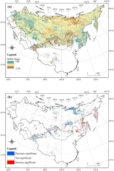 - The variation in snow phenology is spatially heterogeneous. In the central Siberia, Pamir and Tibetan Plateau, the SOD tends to be delayed, the SED shows an advancing tendency, and the SDDs decrease from 2000 to 2016. While in the relatively low altitude plain areas, such as the West Siberian Plain and the Eastern European Plain region, the SOD tends to advance, the SED tends to be delayed, and the SDDs increase, but the increase is not significant.
