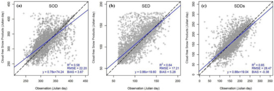 Cross-validation of snow phenology parameters ((a) SOD, (b) SED, (c) SDDs) between cloud-free snow cover product and ground observations. The blue line is the linear fit between cloud-free snow cover product and ground observations. The grey points show the agreement between cloud-free snow cover product and ground observations.