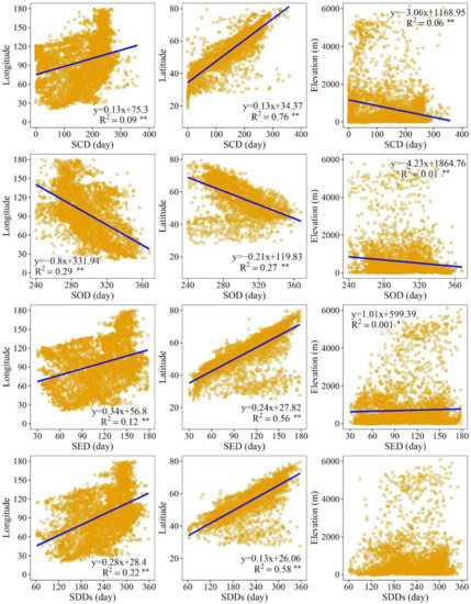 The variation of annual mean snow phenology characteristics with the change of latitude, longitude and elevation in the study area from 2000 to 2016. The blue lines and yellow dots represent the linear fit and agreement between snow phenology parameters and longitude, latitude, and elevation, respectively. Significant codes for linear regressions: **, p < 0.01; *, p < 0.05.