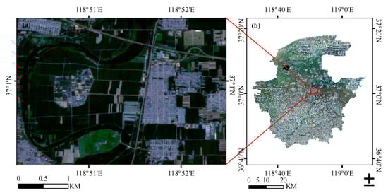 The studied area with Sentinel-2 composite. (a) Sentinel-2 composite (bands 4, 3, and 2 assigned to the red, green and blue) in the study area with a 10-meter resolution; (b) Sentinel-2 composite (bands 4, 3, and 2 assigned to the red, green, and blue) in Shouguang City.