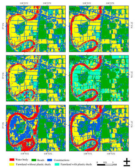The normal optical classification using Sentinel-2 images and the random forest classification using S_Gamma bands and normal optical classification. (a) Random forest classification result based on Sentinel-2 on 10 August 2018; (b) Random forest classification result on 2 August 2018; (c) Random forest classification result on 21 July 2018; (d) Random forest classification result on 27 July 2018; (e) Random forest classification result on 20 August 2018; and (f) Random forest classification result on 26 August 2018.