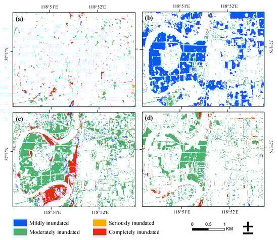 According to the flood evaluation criteria in Table 5, the final flood extent maps are shown in Figure 6a–d. The detailed flood conditions can be summarized as follows: On 21 July 2018, there were many scrappy and small flooded fragments, and no obvious flood in general. The flooded fragments may be due to image quality, which is analyzed in Section 4.2. On 27 July 2018, most of the farmland without plastic sheds was mildly inundated, and most of farmland with plastic sheds was moderately inundated. On 20 August 2018, the flood was in the most serious state (shown in Figure 6a), and the flood in the west region was more serious than that in the east region, which was probably surrounded by rivers in west region. The completely inundated areas were along the Mihe River, especially in the river bends. The farmland without plastic sheds in the west of the study area was moderately inundated, but the farmland with plastic sheds was completely inundated. There were many moderately inundated discrete small areas along the constructions. On 26 August 2018, the flood receded a lot in general (shown in Figure 6d), and the flood in the west region was also more serious than that in the east region. The completely inundated areas almost completely disappeared except for some minor areas along the Mihe River and the farmland without plastic sheds was still moderately inundated in a few areas.