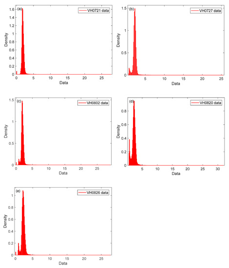 The Otsu thresholding relies on image histograms and a bi-modal histogram is essential for proper separation. Because water bodies were more easily detected under VH, only GRD products of VH were used. The histograms of five images are shown in Figure 7.