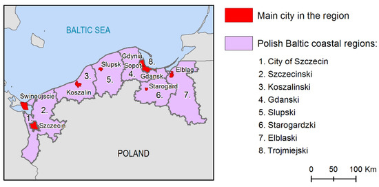 The study covers the Polish Baltic coastal zone as defined by Eurostat [20], namely the NUTS3 administrative division having a border with a coastline or with more than half of their population living less than 50 km from the sea. It comprises the eight regions: Elblaski, Gdanski, Trojmiejski, Slupski, Koszalinski, Starogardzki, Szczecinski, and the city of Szczecin, as shown in Figure 1. They are further divided into 37 counties (NUTS4). Socioeconomic transformations and the incessant development of tourism, recreation, and associated services, as well as intense exploitation of marine resources have recently increased the role of the Polish coastal regions.