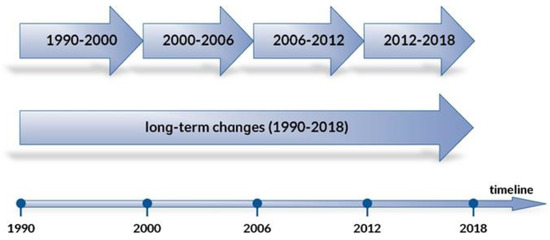 CORINE Land Cover (CLC) is the European land cover database containing information on the physical and biological cover of the Earth’s surface including artificial surfaces, agricultural areas, forests, (semi-)natural areas, wetlands, and water bodies [24]. The information capture is generally based on computer-assisted photo-interpretation of satellite images (see Table 2), according to agreed, standardised, and hierarchical nomenclature. The temporal span for satellite acquisition data, as well as the sensor used for capturing the images, are the primary sources of uncertainty, significantly affecting the interpretation of land cover [25]. The first (highest) level comprises five land cover types, namely (1) artificial surfaces, (2) agricultural areas, (3) forest and semi-natural areas, (4) wetland and (5) water bodies, which are further divided into 15 land cover classes (level 2), and 44 classes at level 3. Until now, five CLC inventories are available for the reference years: 1990, 2000, 2006, 2012, 2018, as well as four LC changes for the periods 1990–2000; 2000–2006; 2006–2012; and 2012–2018 (see Figure A1). In Poland, the datasets are derived free of charge from the Chief Inspectorate of Environmental Protection [26].
