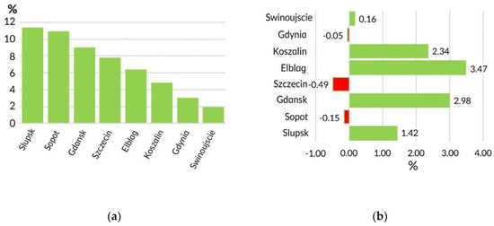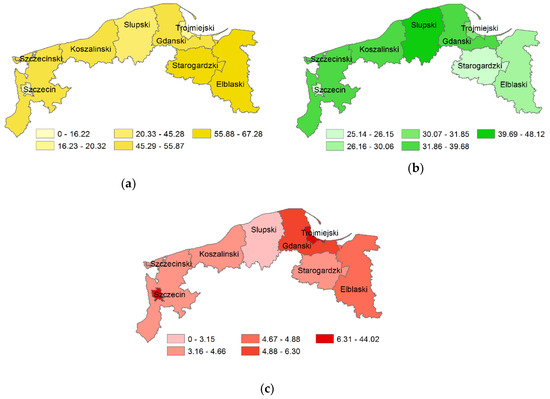 It is worth noting that respectively, 16% and 20% of the areas of the only two urban agglomerations, Szczecin and Tri-City (Gdansk, Gdynia and Sopot), are occupied by agriculture. One of the characteristics of the Polish Baltic zone landscape is the high percentage of forests, scrubs, and herbaceous vegetation (Figure 3b). The average forest cover in the Baltic region amounts to 33.8% (11,852.75 km2) and is higher than the national average equals of 29.5%. On average, there is 0.3 ha of forests per capita, which is 0.06 ha more than the national average, but still two times lower than the world average: 0.62 ha [41]. Forests occupy nearly half of the Slupsk region area, 48.1%, while in Koszalinski they occupy as much as 39.6%. A relatively small area, but still slightly more than 25%, of forested land exists in the Starogardzki region and Szczecin city, 26.2% and 25.1%, respectively. Moreover, forests cover a relatively large part of the Trojmiejski region, 31.8%. This is about 2.5% more than the national average, which makes this agglomeration one of the greenest ones in Poland. The urbanisation level, i.e., the share of artificial surfaces, in the Polish Baltic regions is also significantly diversified, with the highest share of 44.0% in the Trojmiejski region and 36.4% in the city of Szczecin and the lowest one (Figure 3c) in the Slupski agro-forestry region. This diversity is also emphasised by the large difference between the mean and median values of urbanisation that amount to 13.4% and 4.6%, respectively.