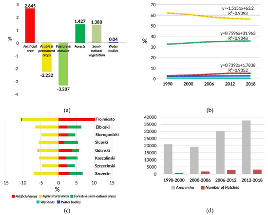 Land cover changes in the Polish Baltic coastal region: (a) net changes in percent 1990–2018; (b) percent of main CLC land cover types; (c) net changes in percent 1990–2018 by regions; (d) total area and number of patches.
