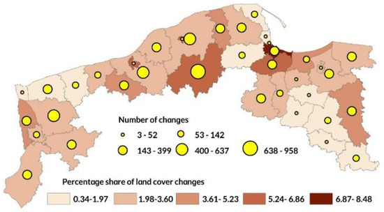 The intensity of the long-term changes (from 1990 to 2018) varies considerably across the analysed area (Figure 5). Gdansk, the largest city on the Polish Baltic coast, has witnessed as much as 8.5% of land cover changes of the city’s area. Moreover, the number of changes in the city amounted to 216, which results in the average area of a change polygon being 10.28 ha. Compared to 1990, land cover changed in 6.2% of the Gdanski county (the land county, neighbouring the city of Gdansk from the south), which makes it the second most affected county. Relatively small changes were recorded in typically small tourist cities such as Sopot (located near Gdansk, in the Trojmiejski region, in the eastern part of the Baltic zone) and Swinoujscie—placed on the west coast (0.3% and 0.9% respectively), and in the agricultural areas of the Elblaski region (from 0.7% to 1.1%).