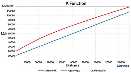 In this study, Ripley’s K function counts the number of neighbouring centroids of land cover change polygons found within a given distance of each central point of an individual land cover change patch. Then, the number of observed neighbouring centroids is compared to the number of central points that are expected based on an entirely spatially randomness. The advantage of Ripley’s K function is the ability to analyse the pattern in the scale function. However, it should be remembered that due to edge effects, patterns are questionable at greater distances [37].