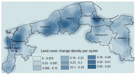 Based on the overall CLC changes data from 1990 to 2018, a kernel density analysis was carried out with a grid cell of 900 m and a radius of 9000 m. The results show that the density of land cover changes estimated by kernel density function is between 0.029 and 0.82 per square kilometres, and the average kernel density of the 7444 CLC changes varies from 0 to 0.67. The visualisation map (Figure 7) can demonstrate the characteristics of land cover changes spatial distribution, one of which is the CLC change concentration in the tri-city region, which is associated with a high intensification of artificial areas. The densification of land cover changes is also clearly visible in large forest complexes located in the regions Szczecinski (Goleniow Forest and Beech Forest), Koszalinski, and Slupski (Central Pomeranian Forests), and in the southern part of the Elblaski region (Elblag-Zulawy Forests).