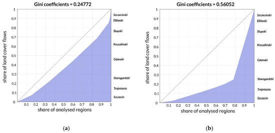 Gini takes values from 0 to 1, with 0 showing perfect equality and 1 representing perfect inequality. The coefficient was used as an indicator of unequal distribution of chosen land cover flows in the analysed areas.