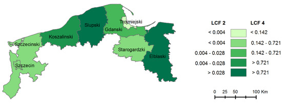 Urbanisation (LF1) is seen in Europe as one of the land cover flows that has the greatest environmental impact [35]. The rate of urban land cover types has been increasing continually, and the total value noticed for years 1990–2018 was 0.49 (Table 6). The marked growth of urban areas and the accompanying infrastructure occurred after 2006, which was caused by an increase in investments co-financed mainly from EU funds.