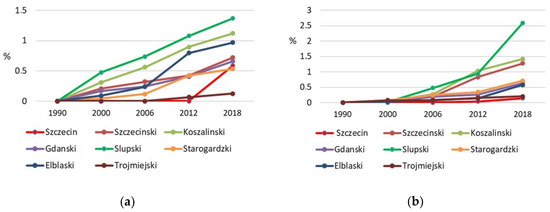 These trends are observed in Europe, Poland [46], and the Polish Baltic coastal zone. Land cover changes in Poland amount to 0.93%, 0.53% and 0.99% respectively in 1990–2000, 2000–2006, and 2006–2012 [43,44], which gives a 0.10% (3348.2 ha) annual land cover change of the total area in the years 1990–2006 and 0.16% for the period 2006–2012. The Polish coastal zone faced slightly slower changes respectively: 0.63%, 0.59%, 0.90% in the subsequent changes, and 1.13% in the last period of 2012–2018.