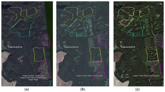 Data checking mainly involved verification of the CLC change code correctness. For the analyses, the correctness of the results of automatic change detection between classes resulting from the comparison of CLC databases from two relevant periods (e.g., 2000 and 2006). The analysis consisted mainly of visual analysis of remote sensing satellite imagery and verification, whether the change in the CLC database corresponds to the situation from multispectral satellite images. The analyses used data from open-source imagery data, i.e., GoogleEarth, USGS, and ESA Copernicus, that were not used when creating the Corine Land Cover databases. About 9% of land cover change polygons, randomly distributed in the Polish Baltic coastal zone for each time horizon and type of changes (see Figure A3), have been visually analysed. The smallest analysed polygon occupied 5 ha, and the largest occupied about 400 ha. The visual interpretation has been supported by the different colour composition of imagery data (Table 4). Prior to visual analysis, pan-sharpening of Landsat7 and Landsat 8 images was conducted. The nearest-neighbour diffusion-based pan-sharpening algorithm [33] was used to enhance the visual quality and improve the spatial resolution (to 15 m) of medium- resolution data. Moreover, almost all CLC changes that may lead to deforestation have been thoroughly investigated to look for forest management practices, in particular, sanitary clear-cuttings and planned logging that could lead to temporal deforestation.