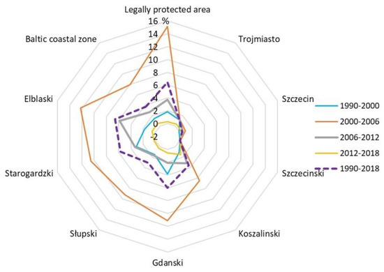 The changes over land use in the Polish Baltic zone in the last three decades only slightly follow the tendency in the neighbouring Baltic countries, such as Germany, Lithuania, and Estonia, where they were much more intensive [10,18]. The results and tendencies obtained in the Polish Baltic zone are much more similar to other coastal countries such as Malta, Cyprus, Bulgaria [46].
