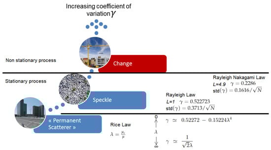 Therefore, it can be considered that the coefficient of variation has different statistical properties for at least three categories of temporal profiles: that of a permanent scatterer; that of a natural area of stable speckle, not necessarily correlated in time, but which is stationary; and finally, that of a non-stationary area that we generally interpret as a change. These three general cases are represented in Figure 1.