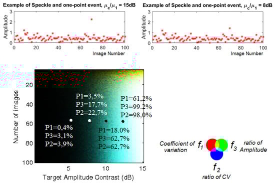 The time series of the amplitude values of each pixel containing a permanent scatterer follow the Rice distribution [29,32]: it corresponds to the superposition of the backscattering of a deterministic target with constant values of phase and amplitude, with an additive fully developed speckle. Let be the backscattering parameter of the target, then the Rice law can be expressed as: if is the amplitude of the deterministic signal and is the parameter of the Rayleigh distribution associated with the speckle noise, the probability that is associated with a given value x can be written as: (with and ):