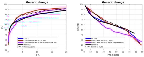 Generic Change Detection (Saclay site, France), PD/PFA on the left, Precision/Recall on the right.
