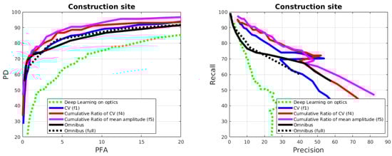 Case of construction site detection (Saclay site, France)—PD/PFA performances/Precision/ Recall performances.